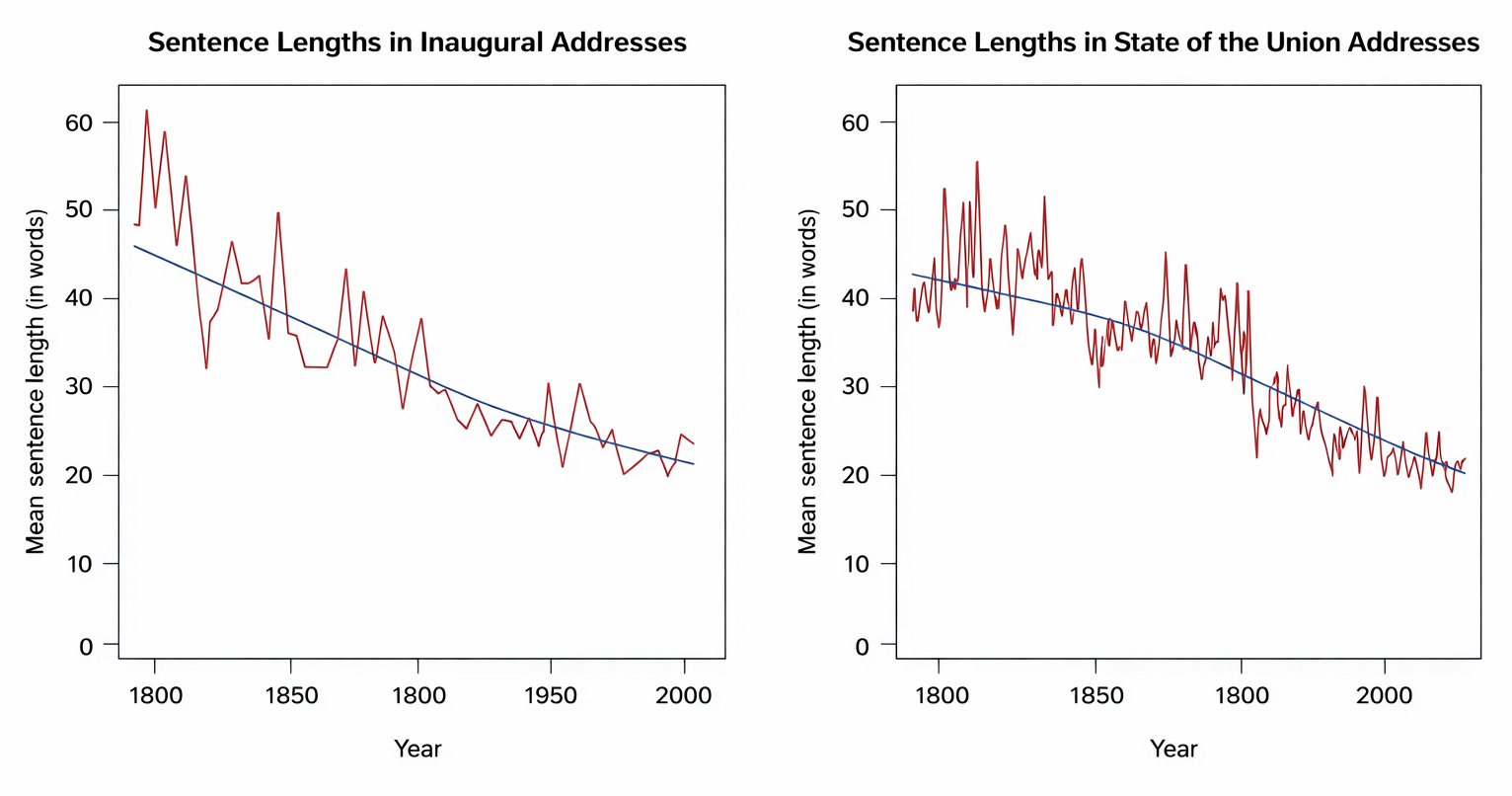 As mentioned above, Arjun Panickssery writes that presidential State of the Union addresses dropped from 40 to under 20 words per sentence, with inaugural addresses following suit.