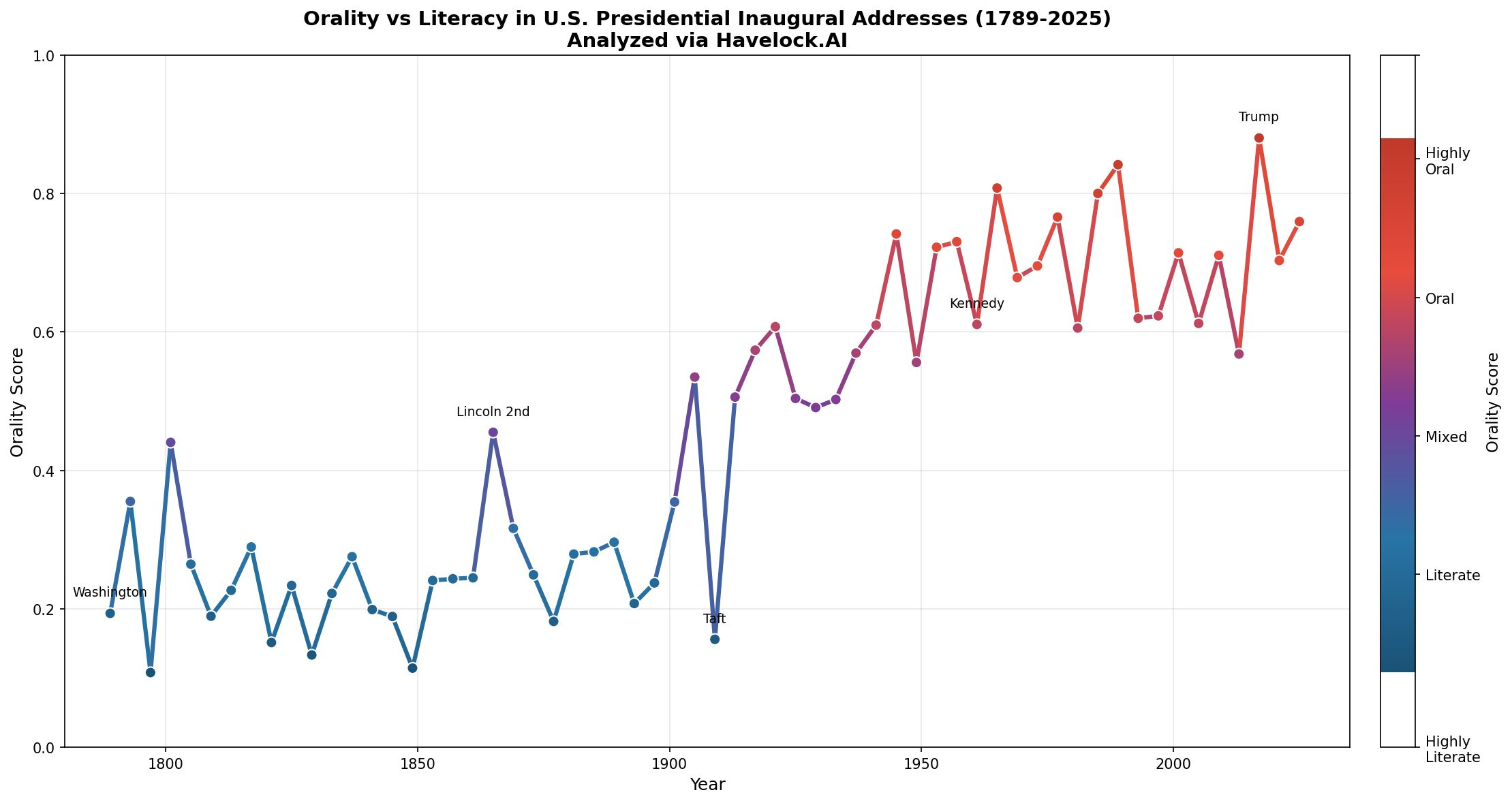 Not only that – it turns out that presidential inaugural addresses have also become “more oral.” There is an app, Havelock.AI, created by Joseph Weisenthal of Bloomberg, that allows users to measure the “scores” of orality and literacy in any text by analyzing specific linguistic features of orality. Using Havelock.AI, Paul Williams found that 19th-century inaugural addresses were predominantly literate in character, while 20th-century speeches showed an increasing ratio of orality. And this happened long before digital media.