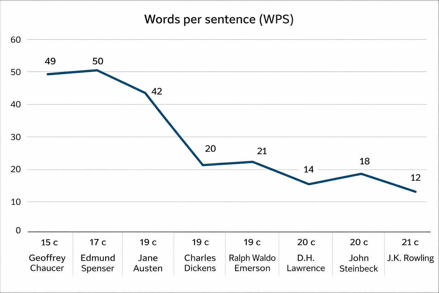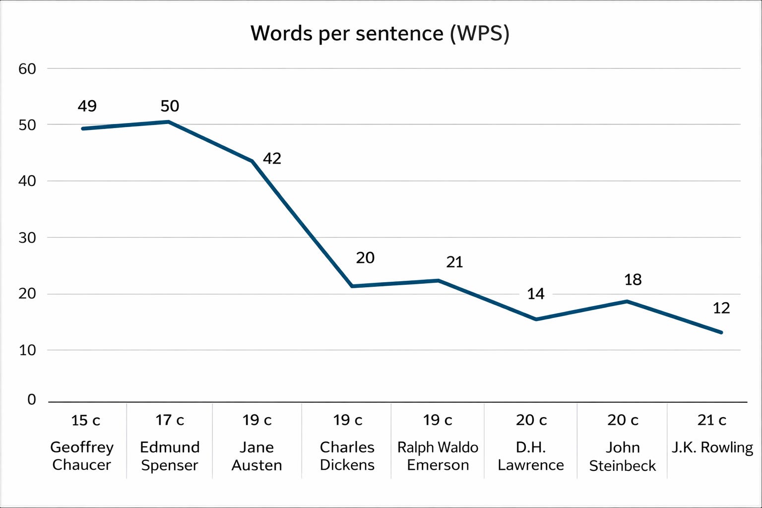 Researcher Arjun Panickssery tracked how the average sentence length has plummeted over centuries – from 50 words per sentence for Chaucer and Spenser to 12 wps in the Harry Potter books.