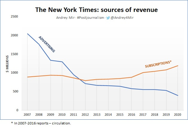 The switch from advertising was not so much a deliberate “switch.” Advertising simply fled from media to online platforms. By 2013–2014, around the world, ad revenue in newspapers had plummeted below the level of revenue from copy sales (including subscriptions). But that does not mean that subscriptions offset the lost ad revenue or succeeded overall.