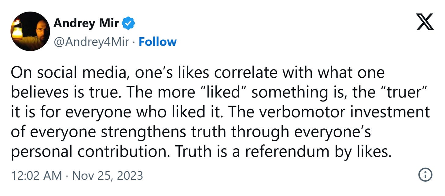 The automated means of reaction, such as likes and reposts, on social media do not require logical deliberation or justification. Under such a design, the point is to express the right attitude, not to convey true information. Truth is a referendum by likes.