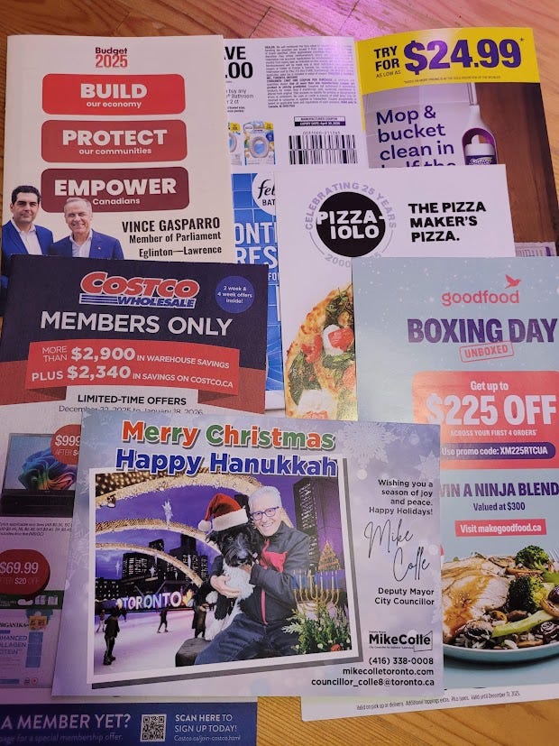My Toronto mailbox can fill with 3-5 local flyers on busy days: restaurants, dentists, appliance repair, real estate brokers, pizzerias. People complain about junk mail, but local businesses need precise local reach, and Canada Post needs the revenue. Direct mail offers targeting without algorithmic gatekeepers—crude, but effective.