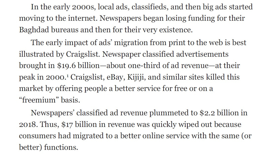 In the 2000s, Craigslist siphoned off nearly the entire classifieds business by offering consumers a better platform, free or freemium. In 2000, at the tail end of the news industry’s golden age, US newspapers generated nearly $20 billion from classifieds alone—about one third of total industry revenue. By 2018, newspaper classifieds had fallen to $2.2 billion. Roughly $17 billion was wiped out of the print ecosystem and reassembled as a more efficient online service, which has lately declined as well.