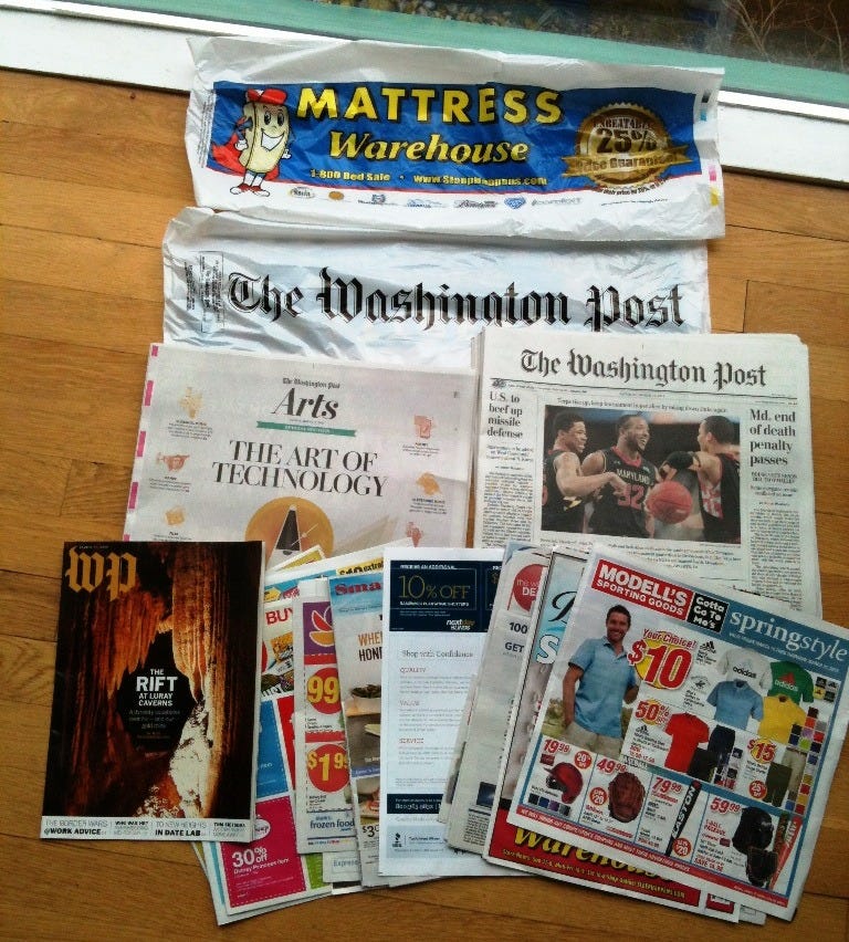 I keep this photo as a relic from a bygone era. Shot on March 17, 2013, it captures a Saturday Washington Post subscription bundle—a four-pound behemoth of newsprint and advertising that tells the story of the media industry’s decline.