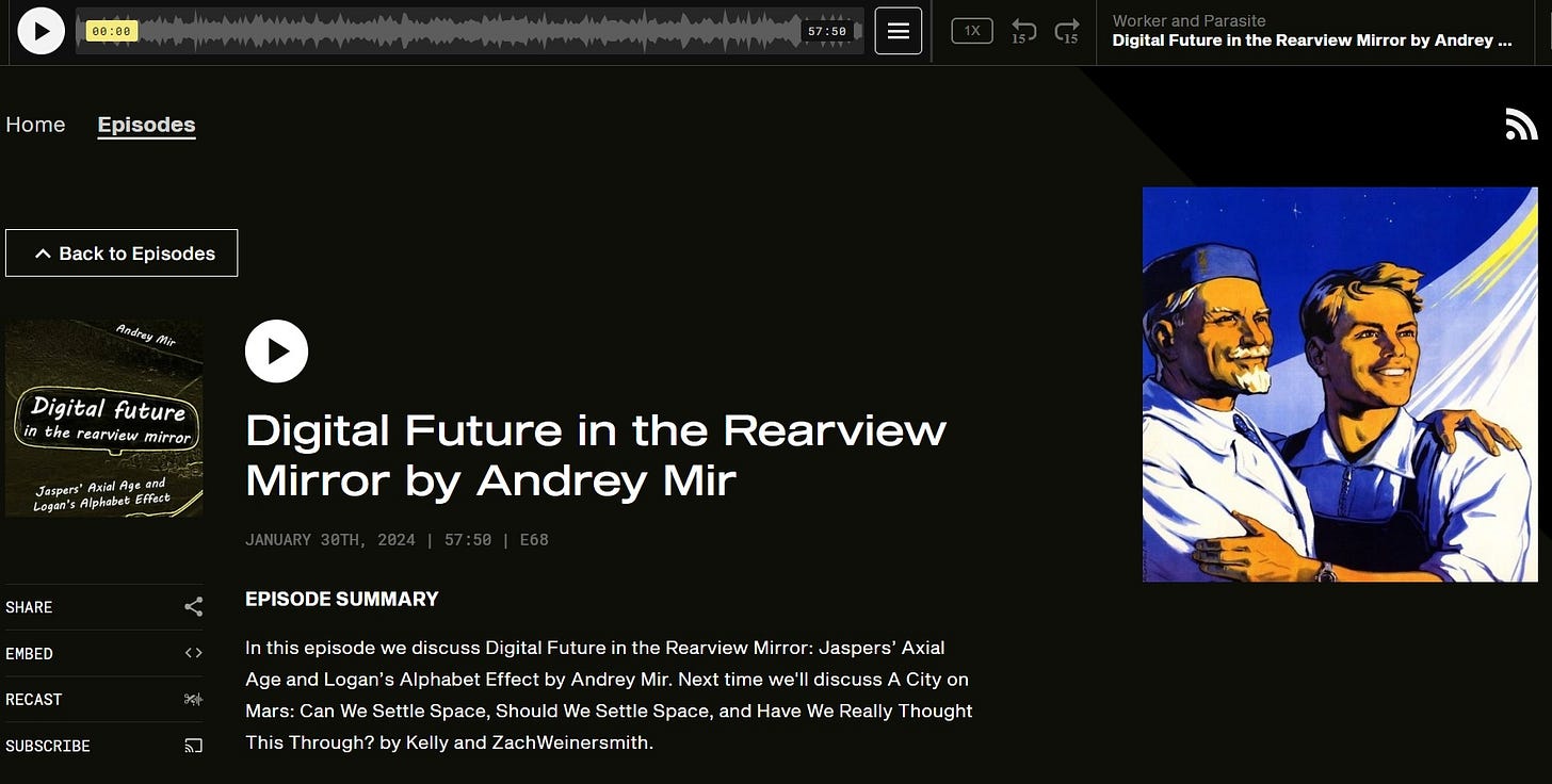 In this episode, we discuss Digital Future in the Rearview Mirror: Jaspers’ Axial Age and Logan’s Alphabet Effect by Andrey Mir.