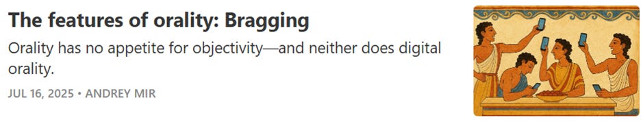 So, orality forces people to affirm or challenge others’ standing to maintain tribal hierarchy (better hierarchy means better survival), while in literacy, quotation drives intellectual challenge to dismiss or build upon. The precision of repetition in literacy is provided by default, by words recorded verbatim, so the cognitive energy is freed for something else, for reorganizing and revising. In literacy, the status game shifts into the space of ideas.