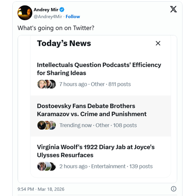 Something unusual happened on X/Twitter recently. Of course, somewhere deep or on the margins, it always hosts highbrow self-expression. But it is usually suppressed by rage bait, which is favored by algorithms due to its higher potential for engagement. But look at what the algorithms highlighted on March 18, at least for me: