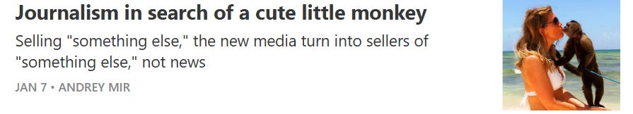 Make no mistake: both points reflect an incredible achievement and a unique business model the Times chose to build in response to the end of the Trump Bump—the surge in subscriptions driven by outrage-fueled coverage of Trump from 2016 to 2020. By 2020, it became clear that peak could not last. The Trump Bump may well have been the last gasp of news business in the 500-year history of journalism.
