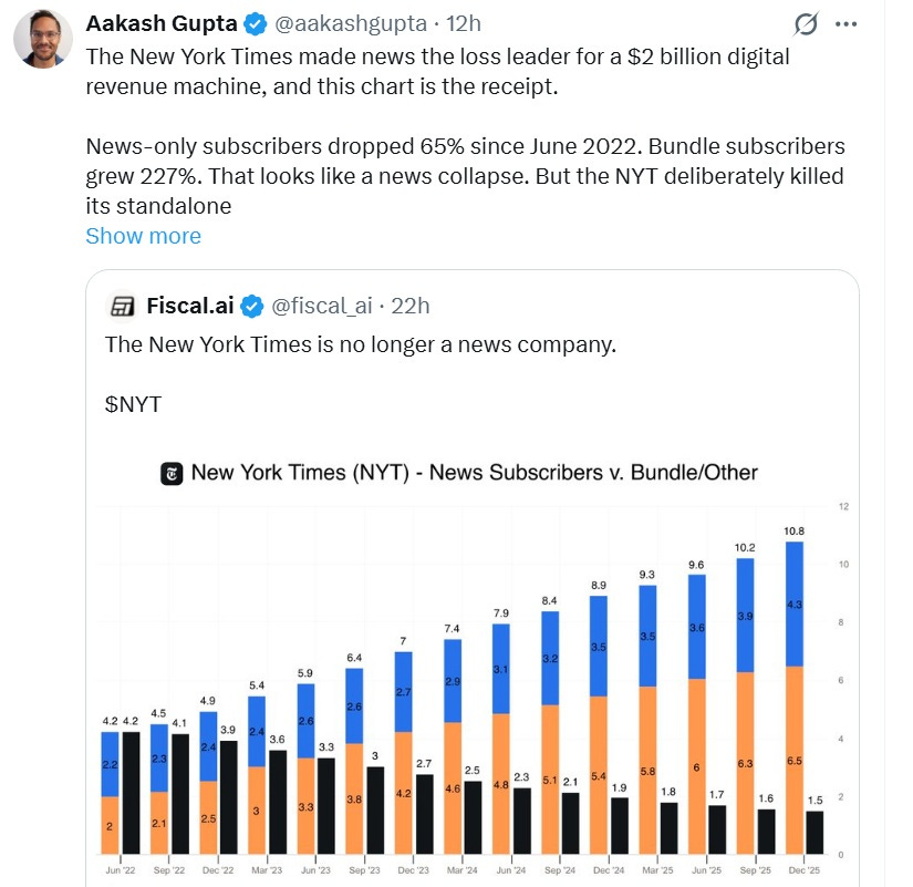 “That looks like a news collapse. But the NYT deliberately killed its standalone news product. They stopped marketing it. They made it nearly impossible to buy a news-only subscription on their website. They priced the full bundle (News + Games + Cooking + Athletic + Wirecutter) at $2/month introductory, cheaper than a standalone Games subscription....