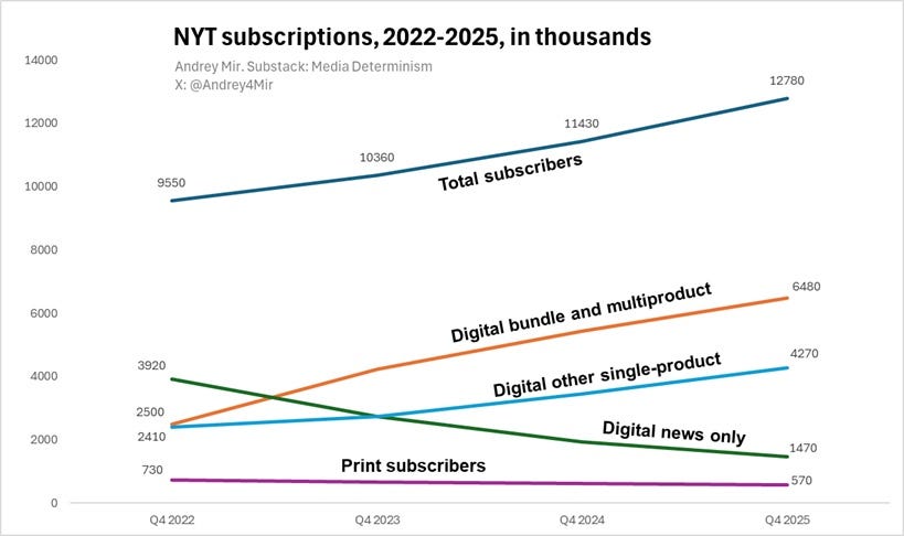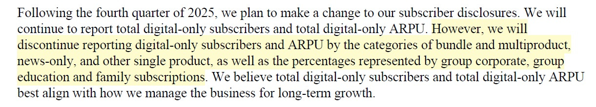 Curiously, in the latest report (Q4 2025), the NYT announced it “will discontinue reporting digital-only subscribers and ARPU by the categories of bundle and multiproduct, news-only, and other single product.” In other words, the growth or decline of news and news-related subscriptions will no longer be publicly visible. The timing is telling: if a company is proud of its core business indicators, it promotes them, not “discontinues” reporting them.