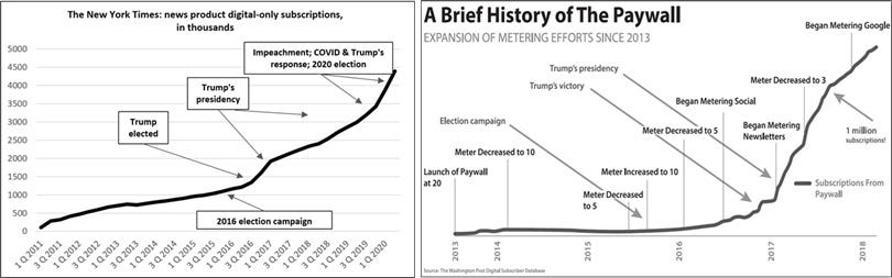 The Trump Bump—the surge in subscriptions at The New York Times and The Washington Post in 2016–2020. Charts from Postjournalism and the Death of Newspapers. The Media after Trump: Manufacturing Anger and Polarization.